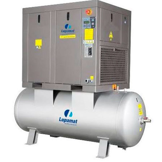 Винтовой воздушный компрессор Lupamat серии MI с воздушным охлаждением и впрыском масла. Конструкция представлена в виде звукоизолированной кабины, установленной на шасси поверх резиновых колодок, и представлен винтовым блоком, электродвигателем с клиноременной передачей и воздушным охлаждением. Предусматривает непрерывный режим работы и используется во многих секторах промышленности.