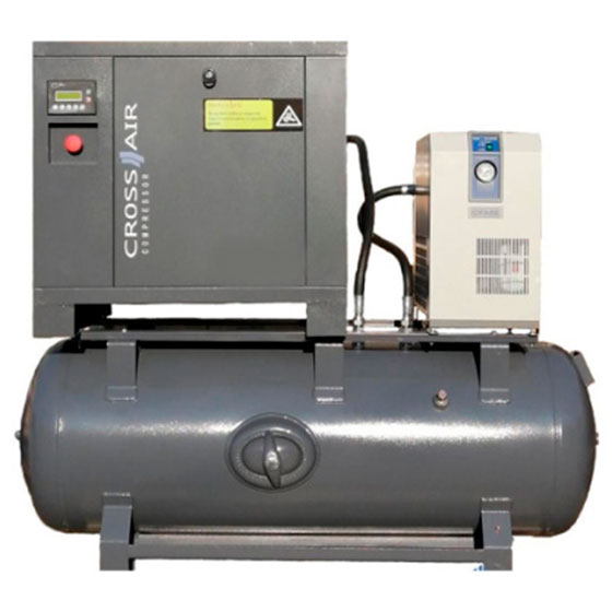 Компрессоры CrossAir на ресивере с осушителем включают в комплектацию стационарный винтовой компрессор серии СА, рефрижераторный осушитель CAAD и ресивер на 500 литров (оборудован специальной площадкой для крепления). В случае необходимости станцию можно дополнительно оборудовать магистральными фильтрами.